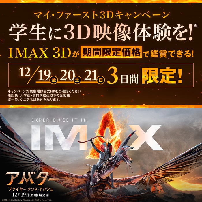 【12月19日(金)〜12月21日(日)限定!】『アバター:ファイヤー・アンド・アッシュ』大学生以下 IMAX3D料金がおトクに!「マイ・ファースト3D」キャンペーン実施決定!